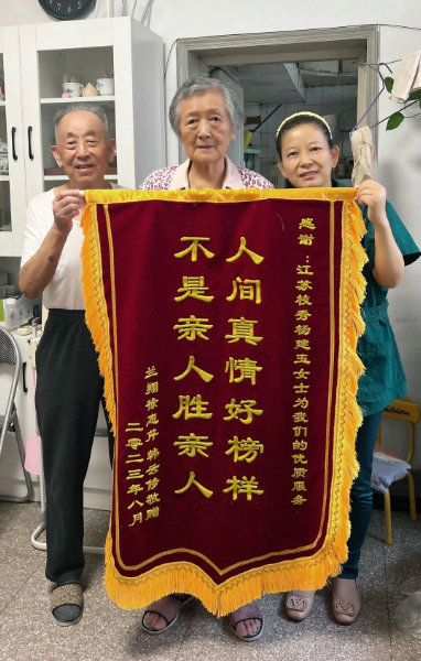 2023年4月18日,顾杏珍、钱龙法夫妇送来锦旗,感谢护理员张志秀的热情服务。