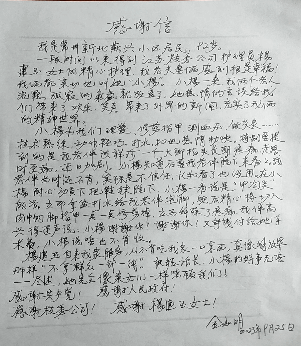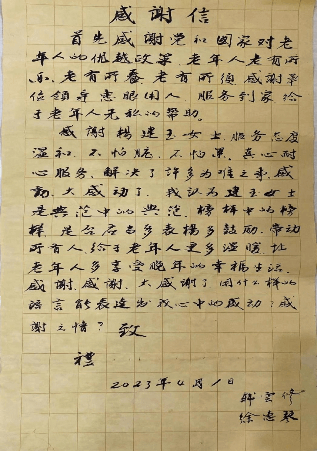 2023年4月1日,张晒度、蒋琴芳夫妇送来感谢信,感谢护理员杨建玉的优质服务。