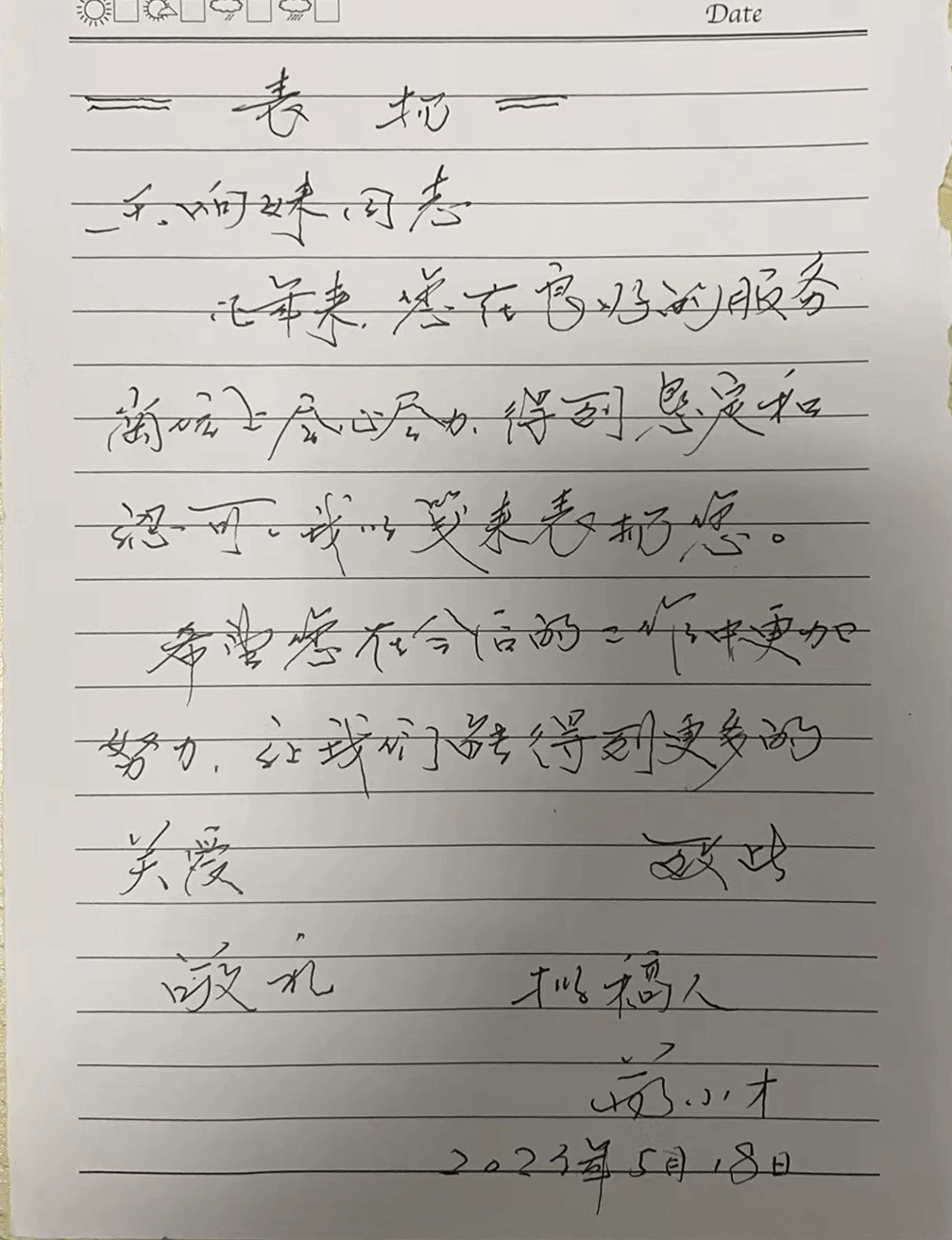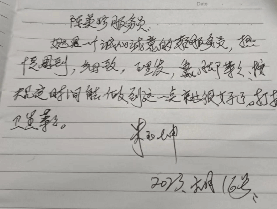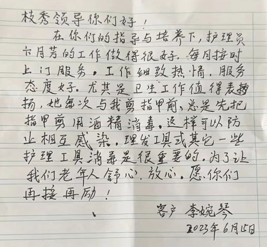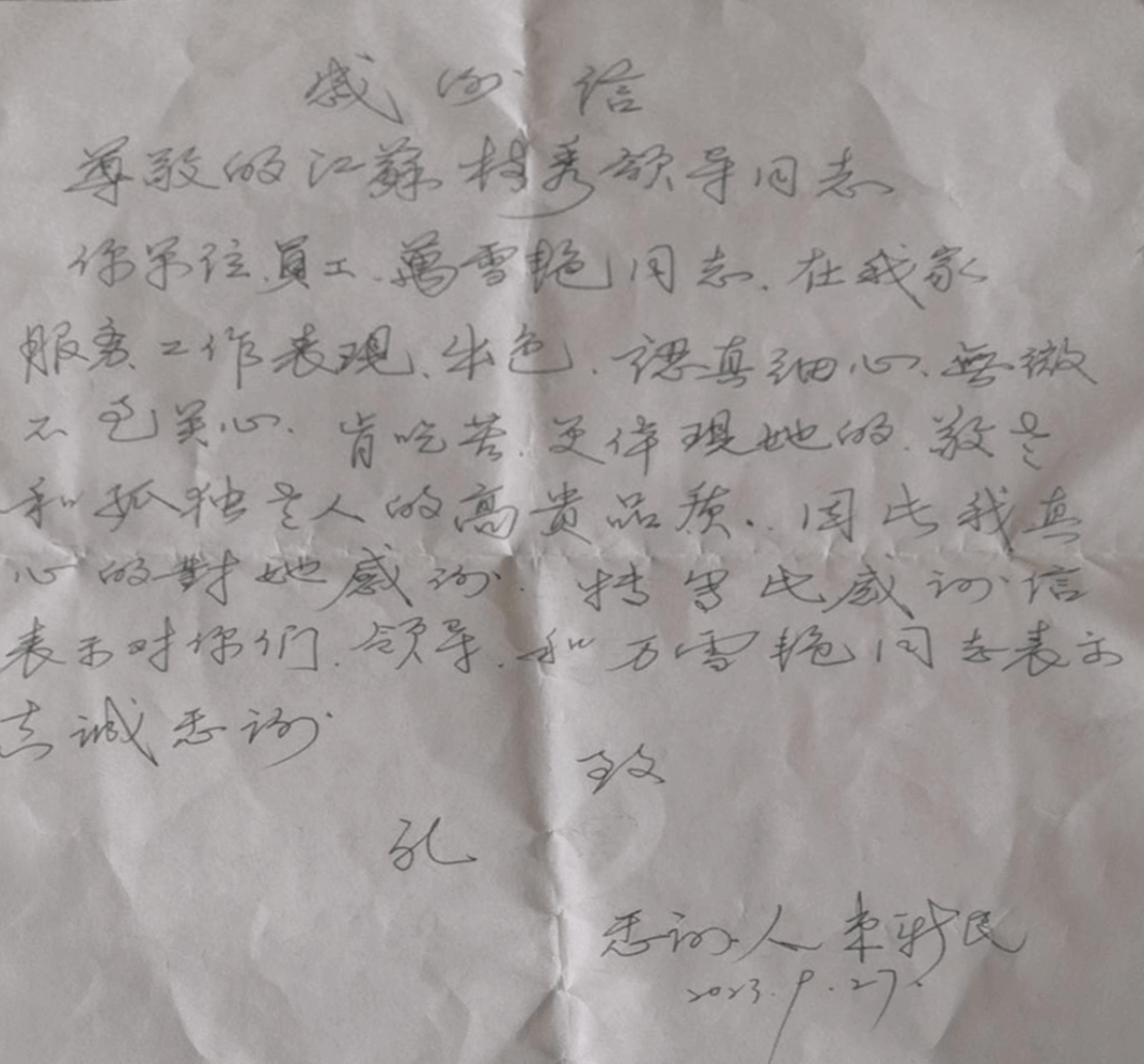 2023年9月25日,张家瑞送来感谢信,感谢护理员万雪艳的耐心服务。