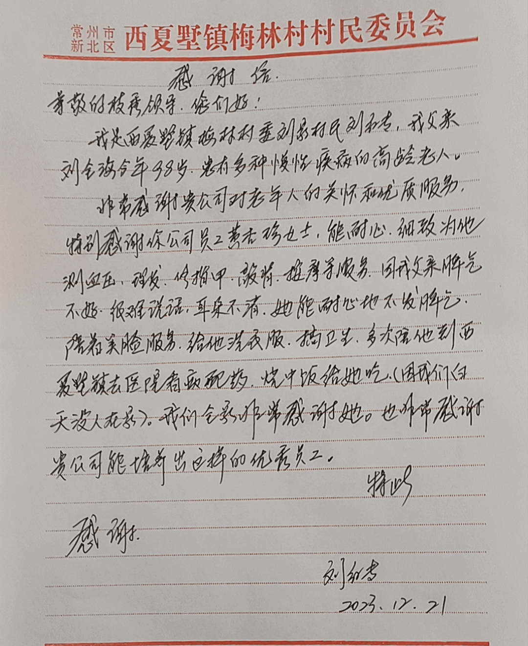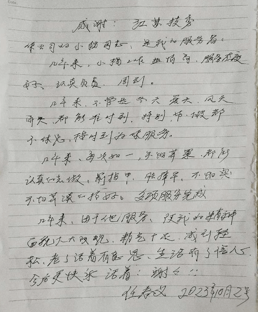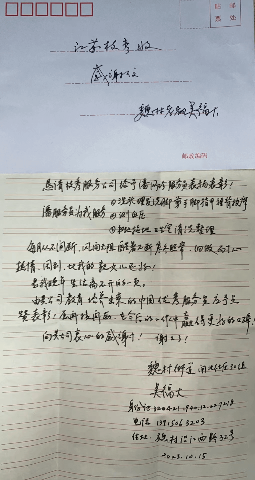 2023年10月17日,殷璋度老人送来感谢信,感谢护理员倪华琴的贴心服务。