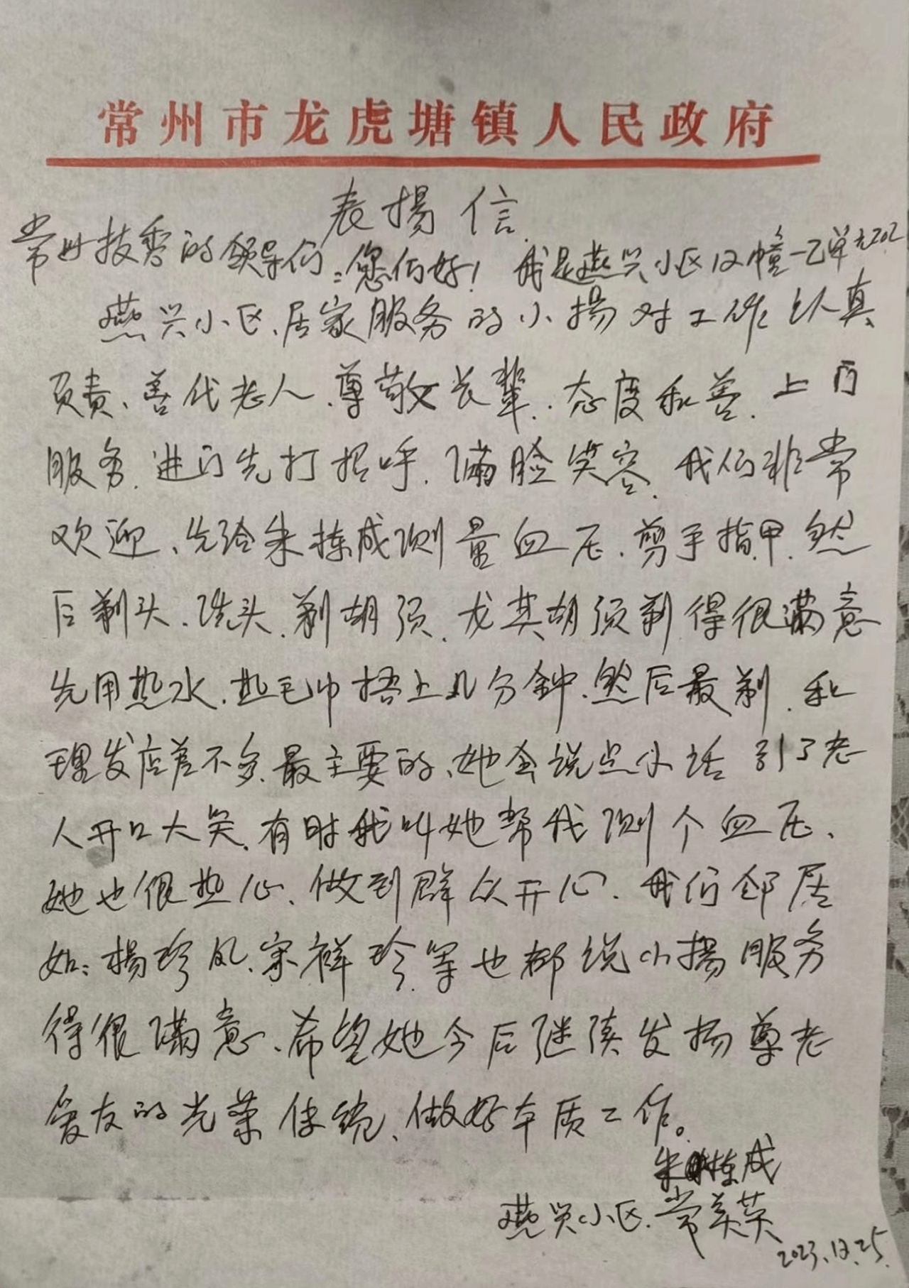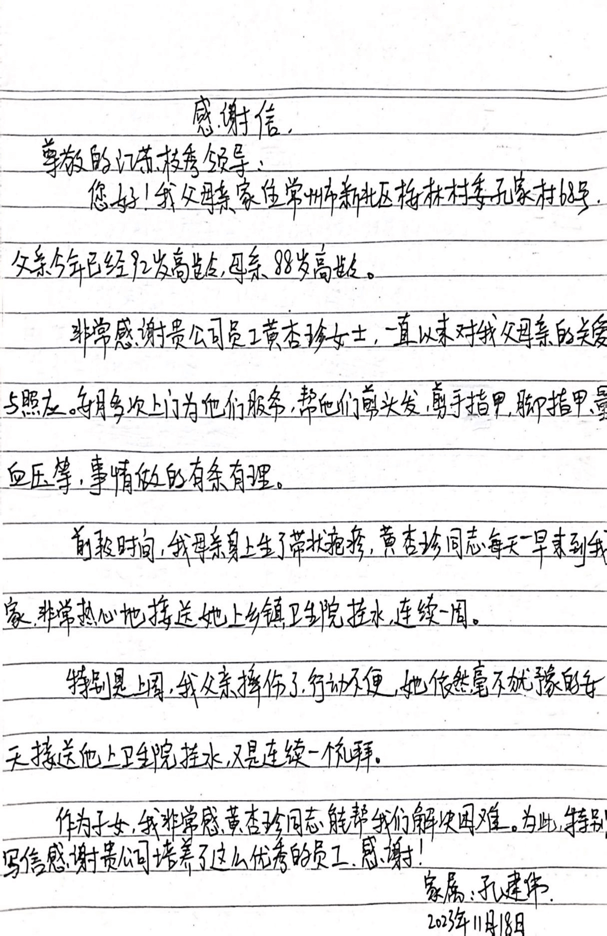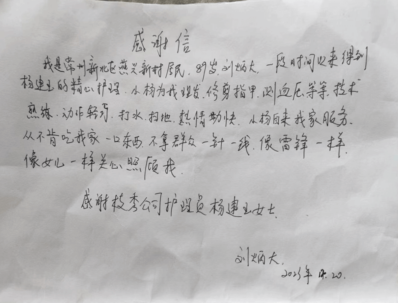 2023年10月17日,殷璋度老人送来感谢信,感谢护理员倪华琴的贴心服务。
