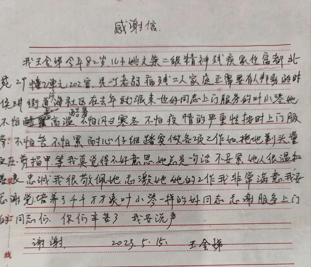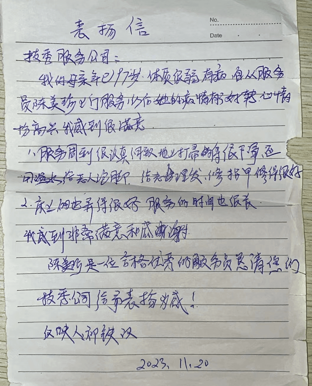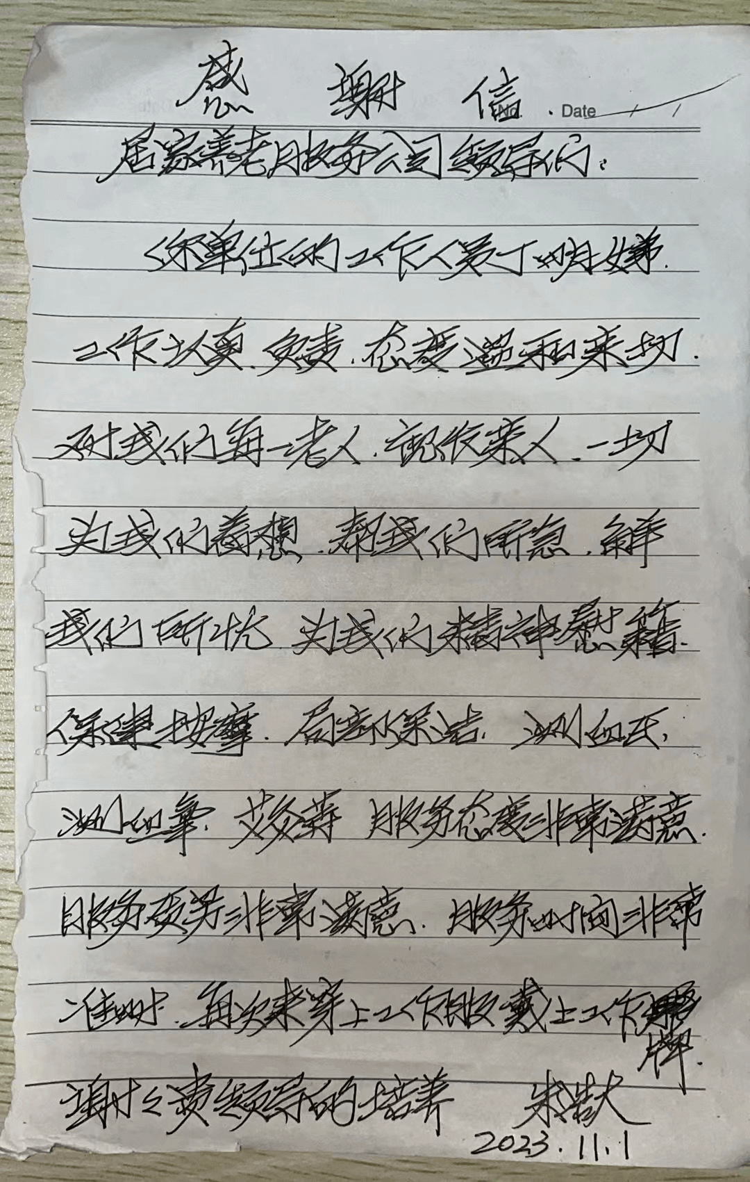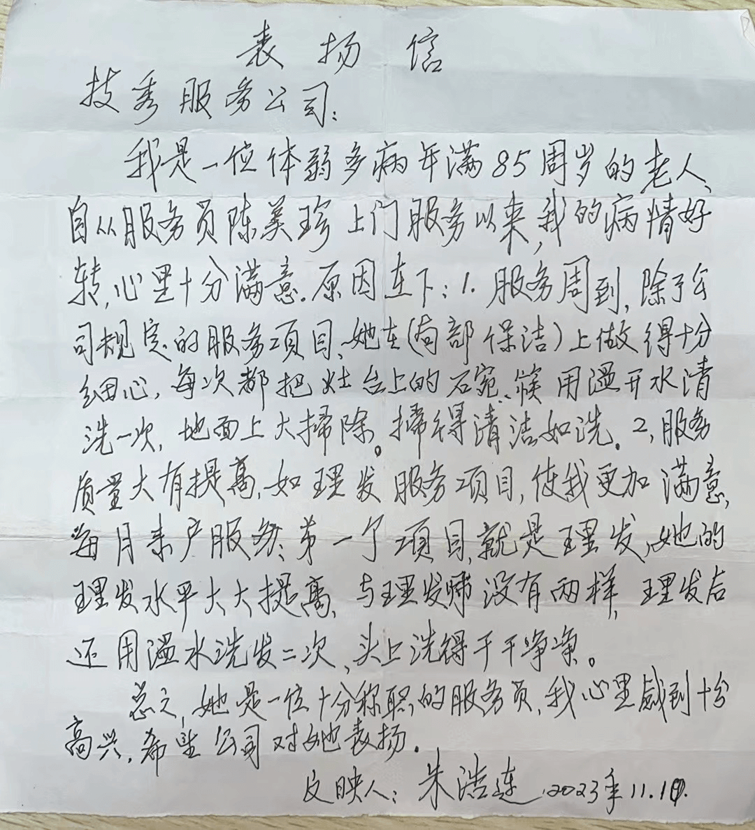 2023年11月10日,冯小江老人送来感谢信,感谢护理员陈保玉的暖心服务。