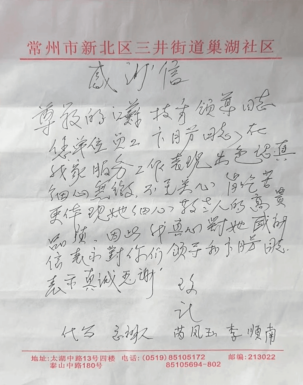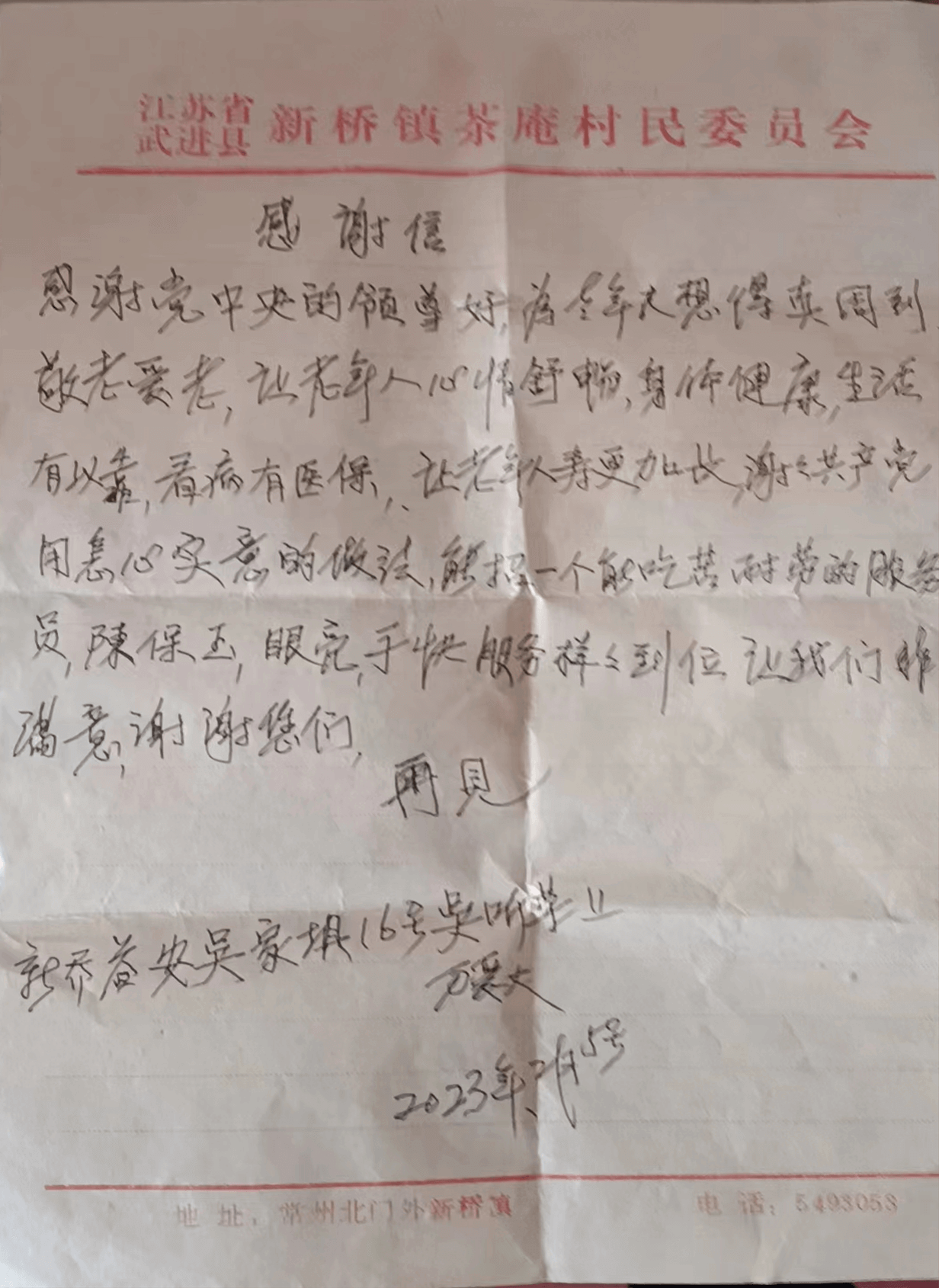 居家养老援助服务是政府聚焦老年人养老服务需求,不断完善居家和社区基本养老服务的民生工程,这一年,新北区居家养老援助服务陆陆续续收到老人写来的感谢信。这些信有的是老人写的,有的是老人家属写的,有的是老人请社区工作人员帮忙写的。字里行间都满溢着对党和政府居家养老服务的感激之情。感谢信的背后,是老人的认可和家属的信任,是一个个温暖有爱的常州市新北区居家养老的小故事。