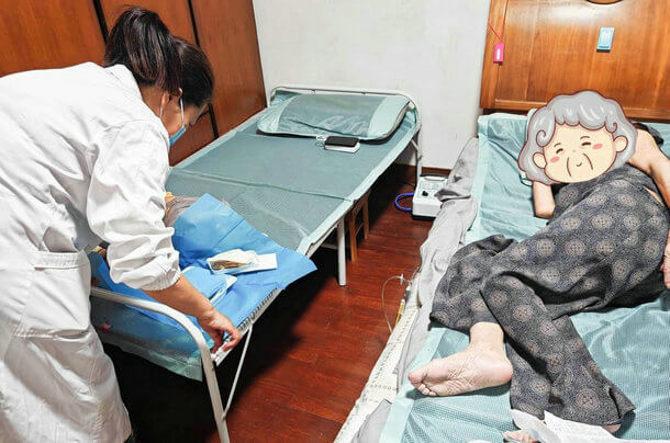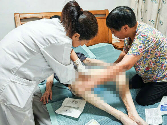 抵达老人家中后,医护人员立即为老人进行身体检查,发现并不是老人将导管拽出,而是尿管置入时间过长未及时更换,气囊自然破裂导致尿管脱出,在确认无出血情况后,医护人员重新为老人置入尿管。操作结束后再次为老人进行了身体检查,确保老人没有其他的不适。由于老人身上多处压疮,医务人员还向家属详细讲解了目前压疮适合使用的敷料、更换时间及注意事项,并叮嘱家属要时刻关注老人的身体状况,如有任何异常可以随时联系万家安护理站。