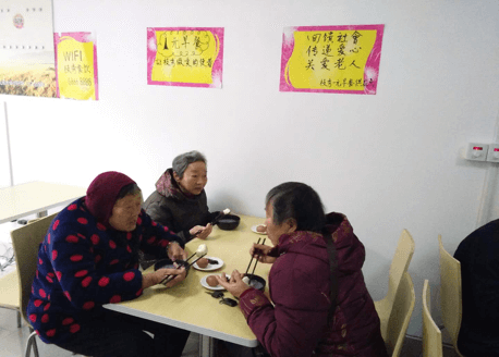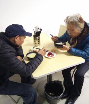 长者们正在开心的用餐,陈大妈说:“在这里吃早饭,开心的呢!平常在家就我一个人,在这里有这么多人可以一起,有说有笑,重点是这里的早餐样式多!味道好!有营养!”