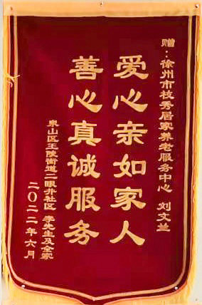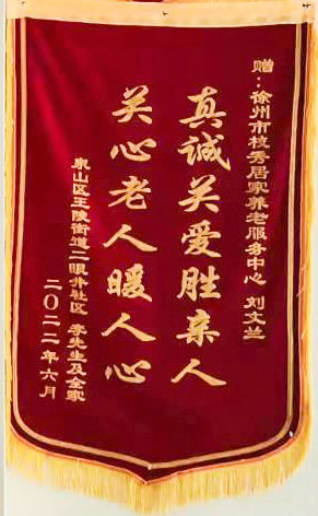 锦旗上写着“真诚关爱胜亲人,关心老人暖人心”、“爱心亲如家人,善心真诚服务”,短短数语,感人至深。字里行间无不透露着对徐州枝秀照护员刘文兰尽职尽责、优质服务的高度赞扬和诚挚感谢,更表达出群众对徐州医保将长护险政策落实到实处、真正解决孤残疾特困群体实际困难的感激之情。