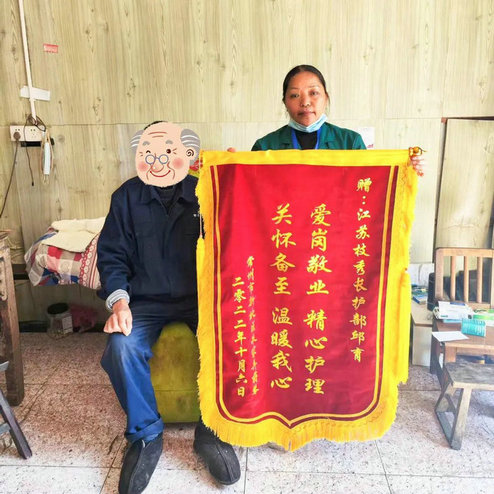 蒋奶奶以及赵爷爷分别送出“爱岗敬业精心护理,关怀备至温暖我心”及“精心护理献爱心,无微不至送温暖”两面锦旗,无不在对照护员邱育的服务表示极大的认可。