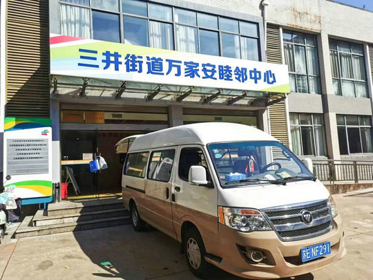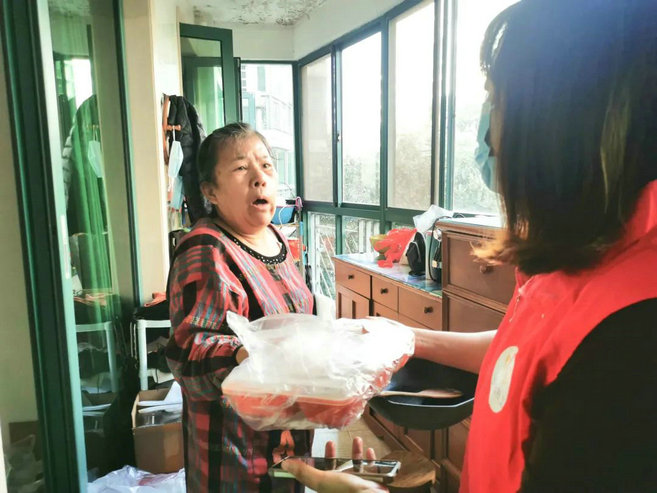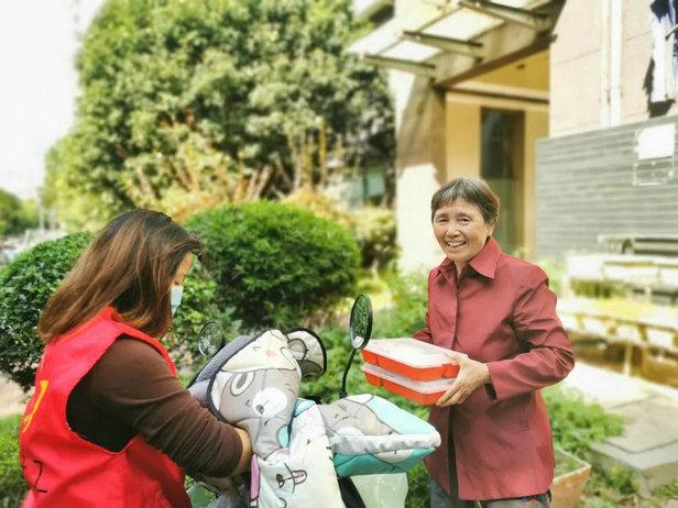 10点30分,负责送餐的员工将一份份热乎的餐食放入保温箱中,乘着送餐车与电动车,送至各社区助餐点。尤其是不方便的老人,送餐员工骑着电动车穿梭在小区内,直接送到老人家中,亲手将营养午餐交给老人。