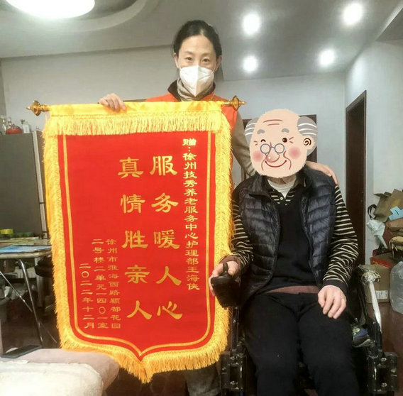 她服务的参保人聂**及其家属对王海侠的服务表示非常的满意,逢人就说有了国家的好政策,又有这么好的护理员让我们家的生活发生了很大的变化。聂**因为患有关节方面的病症,整个人活动不是很方便,人也因此变得很慵懒不愿意多活动。王海侠从开始服务就很耐心的帮她按摩,这样有利于她身体血液的循环,能起到一定康复的作用,时间长了她的身体和心态都发生了令人可喜的变化。聂**的老伴说:“小王每次服务都会和我们提前约好时间,从来没有迟到过,来到后就会立刻帮老伴按摩、翻身、洗澡,帮我解决了很多棘手的问题,特别是洗澡,是一件很消耗体力的事,但是她从来都没有抱怨过,也没说过累。她在服务过程中也很热心,按摩时会主动和我老伴聊天,逗的我老伴非常开心,我们都很感谢小王,为我们提供了那么多的帮助,既热情又非常有耐心。”在感激之余,老人特意制作了一面写着“真情服务真情爱,不是亲人胜亲人”的锦旗送给王海侠,以表示真诚的谢意。