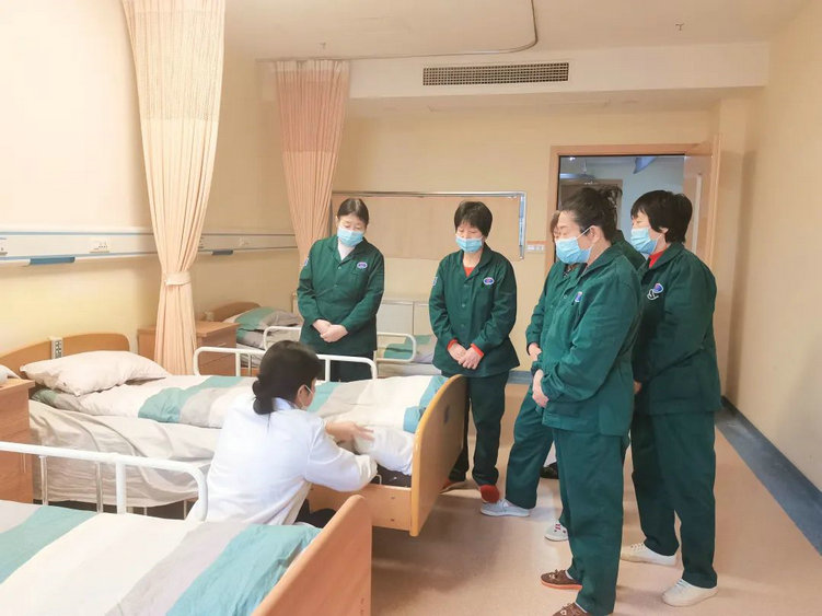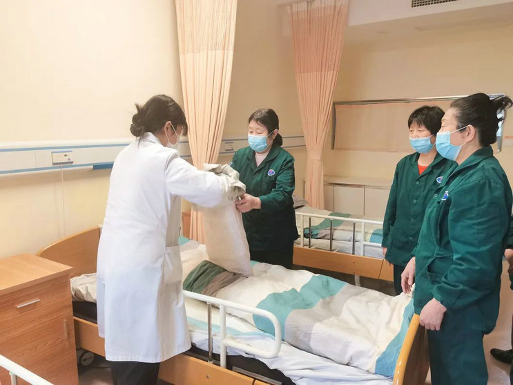 3月14日培训的内容是“更换床单元”,由护理部护士李佳讲解更换床单元的基础知识,让护工知道更换床单元的基本操作手法和注意事项。讲解完毕,接下来是每一位护工进行操作练习,王主任在现场进行监督,在护工出现错误时进行及时的纠正和指导,最后进行考核验收,务必让护工们牢牢掌握更换床单元的操作手法。