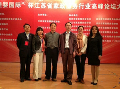 我公司王总在江苏省家政服务行业高峰论坛大会上与领导等人合影。右一:省家协秘书长张乔;右二:王秀总经理;右三:省商务厅李处长;左三:江苏经贸职业技术学院国家鉴定所所长东升;左二:连云港家协秘书长、市政协委员赵家红