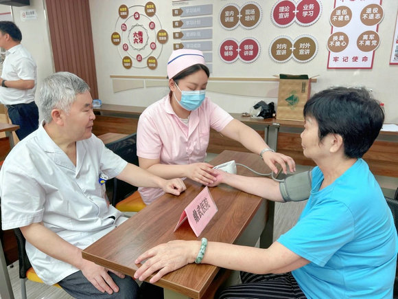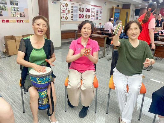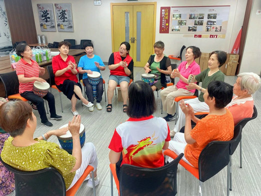 启动仪式现场,海棠社工带领国宾社区老年朋友们体验了一次奇妙的音乐心灵之旅,通过奥尔夫音乐疗法的演绎,用非洲鼓、手摇铃为经典歌曲《外婆的澎湖湾》伴奏。老年朋友们受现场氛围感染,纷纷拍起鼓、摇起铃,跟着节奏沉浸在悠扬的音乐声中,平复情绪、舒缓身心。音乐如同汩汩的流水,浸润了每个人的心田。此外,联盟成员的专家组成的志愿服务团队在现场为老人开展了心理咨询、血压测量、健康咨询等服务,细致多元的服务获得了不少老人的认可。