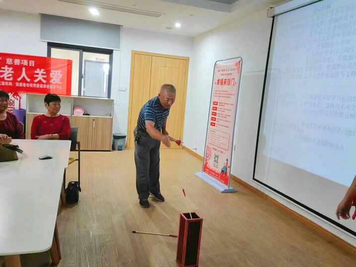 首先我们对“幸福来敲门”空巢老人关爱项目、资助企业苏高新(张家港)节能环保创新园以及承办单位张家港市枝秀居家养老服务中心进行简要的回顾,然后开展一场热身游戏——投壶。古时候文人墨客把投壶当成是一种修身养性的活动,后来投壶逐渐在民间被发扬光大,成了平民百姓日常的一种娱乐消遣。老人们感到很新奇,都跃跃欲试,投中的箭羽一支接一支,“五个、六个……好!”老人兴奋地数着,眼睛都笑成了弯弯的月牙,气氛逐渐活跃起来了。
