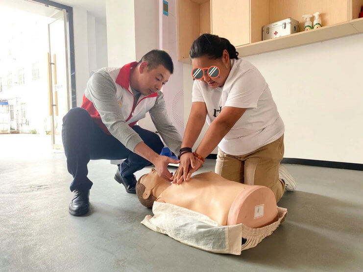 培训开始,邵老师利用图文并茂的课件、生动形象的教学案例,向学员们通俗易懂地科普心肺复苏术是第一时间抢救生命最有效的办法。老师通过理论加实操的形式,利用模拟人进行心肺复苏的模拟操作,对应急救护过程中的细节和注意事项进行了分解讲述和示范。 现场对学员进行一对一指导,提高了学员的急救知识水平,课堂氛围非常活跃。