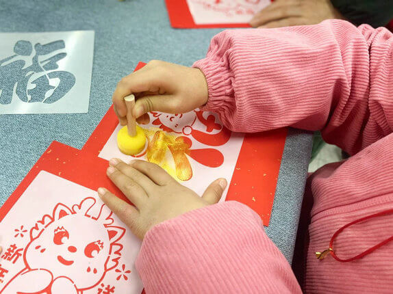 通过对准、涂金、按压、深度拓印等拓福步骤,孩子们制成了一幅幅金福字作品。拓印让孩子们感受到一种与历史对话的独特乐趣,对中华传统文化和历史有了更深刻的认知。通过亲手制作吉祥福字画,感受精致的传统之美,传承那份传统的春节仪式感,营造更浓烈的新春氛围。