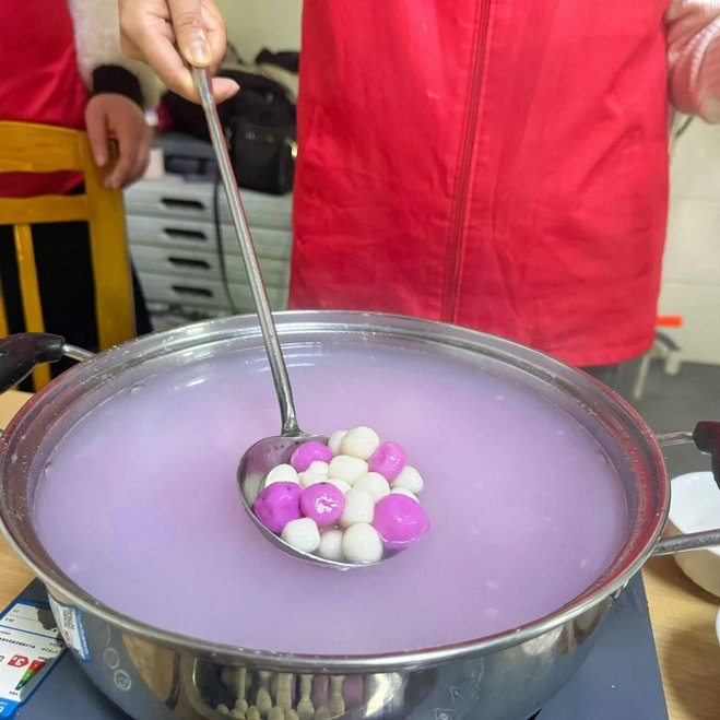 每一个传统节日都拥有属于自己的美食,社区元宵节做元宵是一个富有传统文化特色的活动,它不仅能增进社区居民之间的交流和互动,还能让大家感受到传统文化的魅力。揉面团、搓汤圆、滚元宵、煮元宵……大家笑容满面、分工合作、忙中有序。在一双双巧手的加工下,盘子里摆满了圆润彩色的元宵,共邀魏村居民一同分享“新鲜出炉”的汤圆,带去了节日温暖与诚挚祝福。