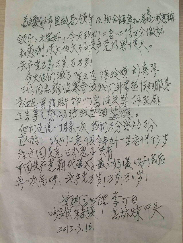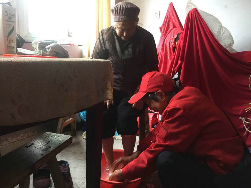 服务到高林妹老人家中时,员工给老人洗头、修剪指甲、做保洁、测量血压、陪他们聊天、倾听老人的故事。这些虽细微却真诚的举动无不温暖着老人们的心,年迈多病的阿公哽咽着,坚持要从床上爬起来给政府写感谢信。临别时,阿公作出震撼心灵的举动,振臂高呼:“共产党万岁!万岁!万万岁!”老人简单而朴实的话语,蕴涵着他们心中对党和政府的感恩,以及对我们服务的感动。