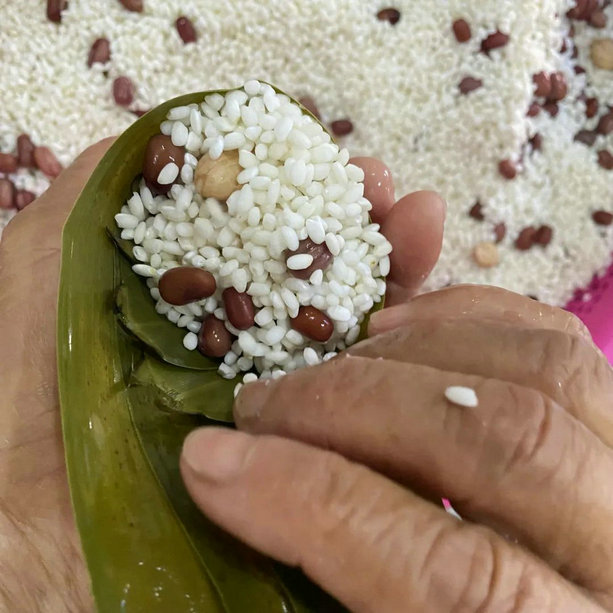 活动中,社工、社区志愿者、长者们围坐在一起,欢声笑语不断,聊端午、话习俗、感受浓浓的节日氛围。捋粽叶、填糯米、压紧实、扎捆线,经过大家的巧手制作,一个个形状各异的粽子呈现在大家眼前。