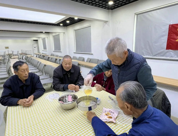 动手实践时,长者们都跃跃欲试,自主组织,分工合作,按照老师讲解的步骤,有的负责搅拌蛋液,有的负责过滤蛋清,有的负责将蛋液倒入到蛋挞皮…大家都全身心地投入到活动中,享受烘焙带来的乐趣和成就感。工作人员将老人制作好的蛋挞放入烤箱中,等待着美味的蛋挞新鲜出炉。