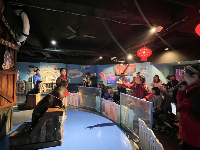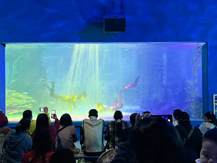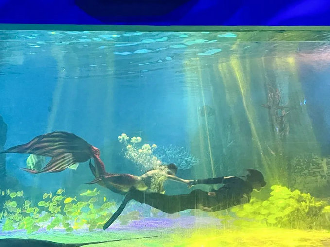 除了近距离观察海洋生物外,“美人鱼表演”吸引住了康复员们的眼球,在梦幻神秘的海底世界,美人鱼公主与王子殿下,在鱼群的簇拥下潜入海底,在水中自由穿梭,给大家呈现了一场无与伦比的视觉盛宴。
