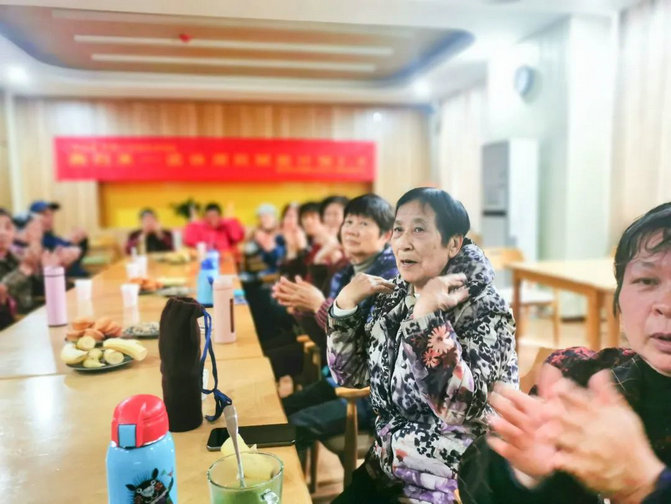 活动伊始,海棠社工带领着老人们做起了极富律动性的《拍拍操》,“头头拍拍、肩肩拍拍、头拍肩拍、头肩拍拍…”老人们嘴里喊着节拍,动作学得有模有样。拍拍操简单易学、节奏适中,能让老年朋友们愉悦身心,使现场气氛瞬间热闹起来。
