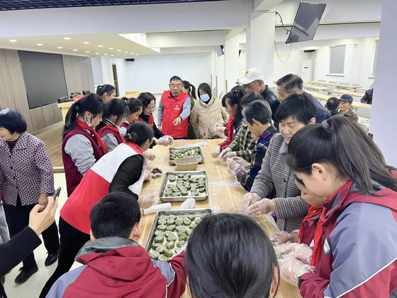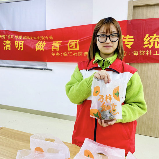 青团蒸熟后,海棠社工将大家合力制作的两百多个青团分发给了老人和孩子们,大家手捧着自己的劳动成果,开心且自豪。