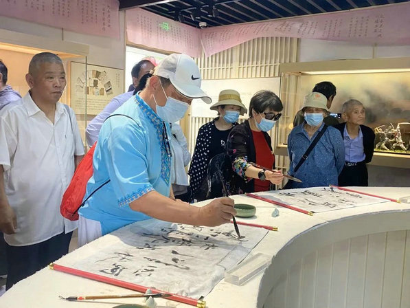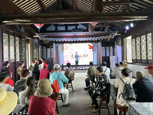 首站,大家参观游览了张家港凤凰山河阳山歌馆。山歌馆以河阳山歌传承的时间与空间为主线,通过现代科技手段展现区域内人类活动的历史遗存、历史名人、民风民俗与非物质文化遗产以及古戏台的山歌演艺。在讲解员的解说下,老人们切身感受到了非物质文化遗产的魅力。