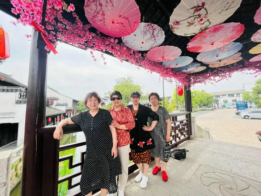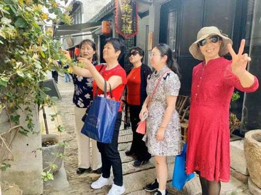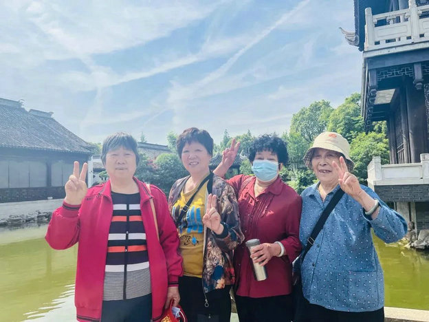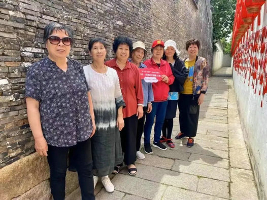 随后,大家来到了恬庄古街。恬庄古街是张家港市重要的历史文化遗产之一,是凤凰镇国家AAAA级景区——凤凰山风景区的景点之一,古街上现存有完整的明清历史建筑群和历史街巷。老人们沿着恬庄北街漫步在古老的青石板步道,看着两边的老房子,砖石上岁月的痕迹见证了古街的繁荣衰败,散发着他独有的气息。大家三五成群,谈笑风生,摆出各种姿势组合拍照留念,一副其乐融融的画面。