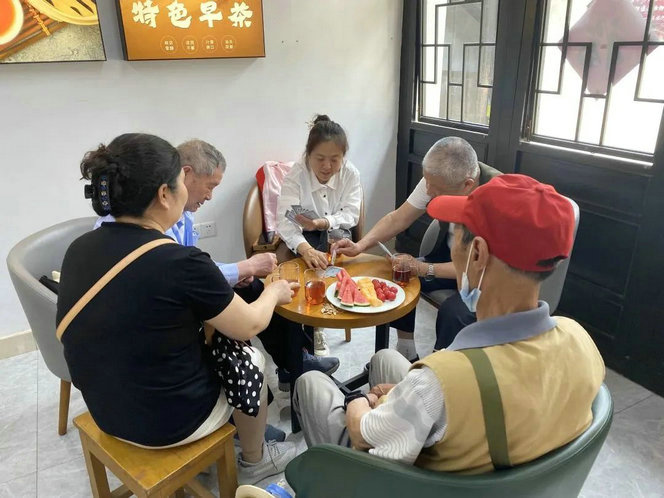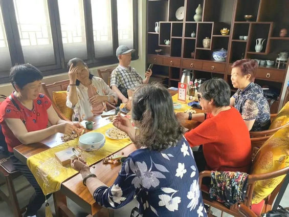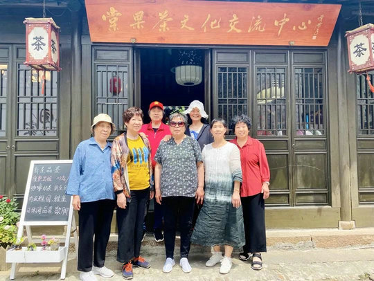 午饭后,老人们一起参观了棠果文旅项目,江苏枝秀棠果文旅项目以棠果茶文化交流中心、北府海棠民宿、棠果书坊、闲雅阁为载体,聚焦“吃、住、行、游、购、娱、赏、学”八大元素,致力于打造全年龄层度假体验游。老人们或是喝茶谈心、或是高歌一曲,优哉游哉,怡然自得。