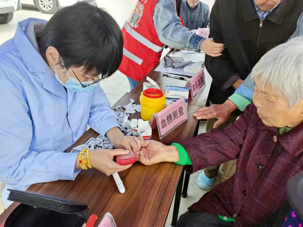 本次健康宣传体检活动包括测量血压、血氧、血糖等项目以及长护险政策宣传。为了让体检活动有序进行,社工及志愿者们分工协助老人进行信息登记、健康体检、咨询答疑、维持秩序等,还帮助行动不便的老人优先进行检测。医护人员耐心地为老人解答健康方面的问题,安抚老人因血压、血糖过高产生的不安情绪,提出相应的健康建议。