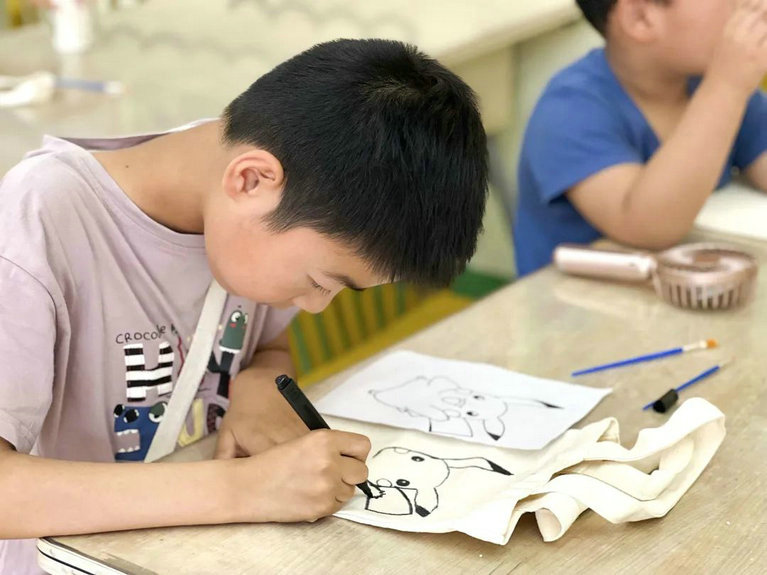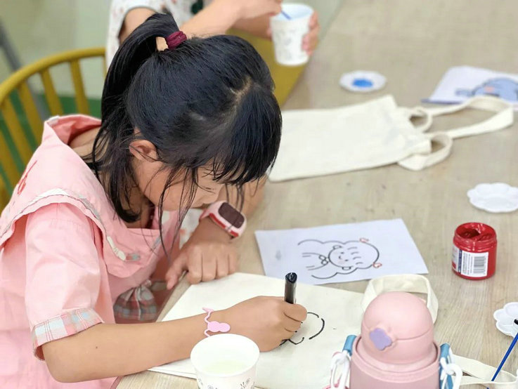 海棠社工为每一位小朋友分发了活动材料:帆布包、颜料、画笔、颜料盘等,同时还贴心地准备了绘画图案供没有画画基础的小朋友们参考和选择。在社工们的帮助下,小朋友们很快就完成了选色、调色等前期工作,开始慢慢进入绘画状态……先是用勾线笔勾勒出图案的大框架,接着用粗线笔进行涂色和填色;孩子们手执画笔,散发思维,发挥想象,在小小的帆布包上天马行空,他们沉浸在绘画的过程中,感受着此刻的美好。经过一个多小时的创作,孩子们用点、线、面加上五颜六色彩绘出一个个独一无二、卡通可爱的帆布包。小朋友们与同伴分享着自己的作品,互相夸赞,脸上洋溢着快乐的笑容,心里充满了成就感。