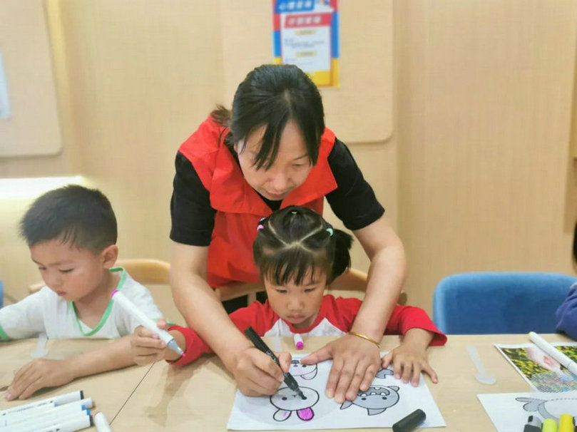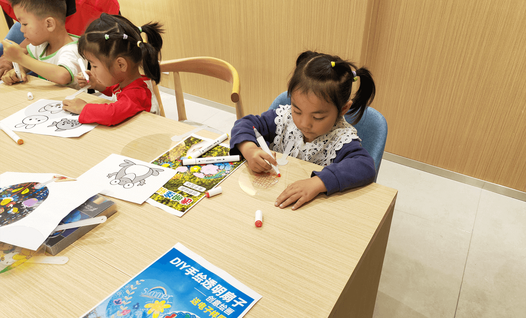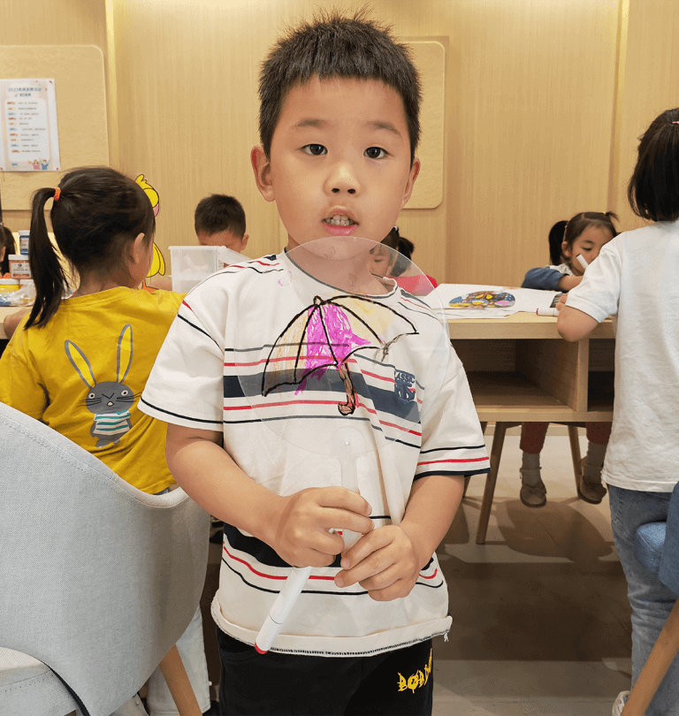 团扇素有团圆、美好之意,也是夏日里的降温“神器”。海棠社工为孩子们讲解团扇的画法和内涵,鼓励孩子们充分发挥自己的想象力和创意,绘制属于自己的特色团扇。大家用自己的画笔在扇子上描绘出雨伞、向日葵、鲸鱼等有趣的图画,在互相交流的过程中,“星宝们”逐渐打开社交圈,与新伙伴们建立了良好友谊。