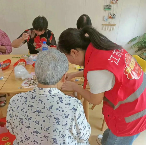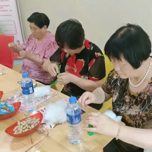 端午到,挂香包,祈安康。在端午即将到来之际,张家港市枝秀居家养老服务中心于6月20日、21日在巨桥老年活动中心、黄家湾书场开展了“幸福来敲门”空巢老人关爱项目——“青春追忆,展望未来”小组活动第四节“携手向前进”,横泾村、巨桥村、蒋家村共有10名组员及黄金湾小区周边5名空巢老人参与活动。大家欢聚一堂,共同制作艾草香囊,感受浓浓的节日氛围,同时提高大家手眼协调能力,缓解孤寂感。