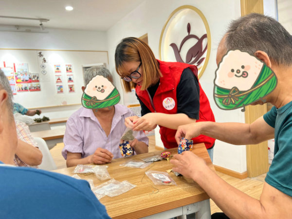 本次活动分为制香囊和包粽子两个环节。大家相互指点、相互帮助,经过一个小时的努力,一个个粽子新鲜“出炉”,一枚枚精致小巧的艾草香囊也跃然出现在大家的手中。康复员朋友看着自己认真创作出来的“作品”,脸上绽放出灿烂的笑容。