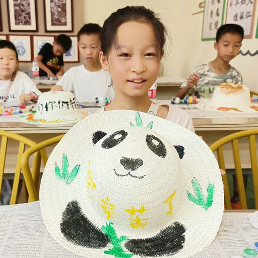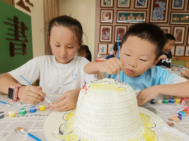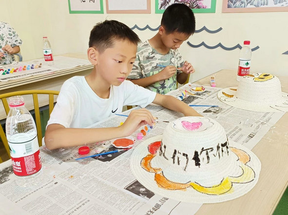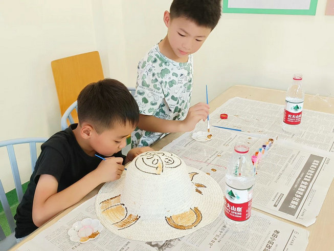 一顶漂亮的手绘草帽,既能抵挡夏日的热意,又能充分发挥儿童的艺术想象力和创造力。海棠社工给孩子们准备好草帽、画笔、颜料等材料,讲解了绘制草帽的方法和技巧,孩子们都跃跃欲试,开始拿起画笔一步一步开始动手描绘。彩虹、笑脸、小动物......孩子们认认真真、耐心细致地画着心中的美好,原本一顶顶简单的草帽,随着时间一点点过去,经过小朋友们的“妙笔生花”,五彩的颜色、生动的图案越来越完整。孩子们还在帽子空白处写下对清洁工想说的话和最真挚的祝福。