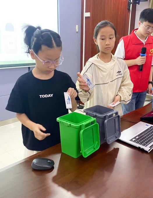 快看,海棠社工志愿者为同学们生动讲解关于垃圾分类的知识。同学们也通过小游戏,加深垃圾分类技巧。