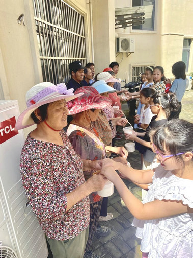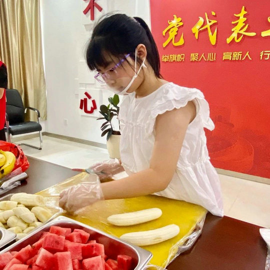 炎炎夏日,酷暑当头,环卫工人们为我们的城市整洁与美丽付出巨大的努力。为表达对环卫工人的感谢和敬意,学生们亲手学习制作水果捞并送到环卫工人手上。戴上口罩和手套,拿起小刀切切切,分类装进水果桶,淋上酸奶,一杯美味爽口的水果捞就制成啦。