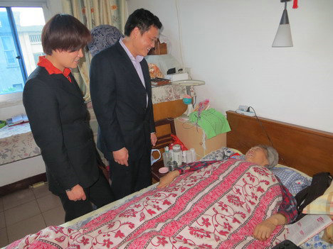 2013年5月9日,常州枝秀家政服务有限公司镇江分公司到服务对象家访问。图为公司吴总向服务对象敬献鲜花,祝服务对象母亲节快乐。