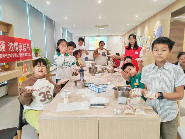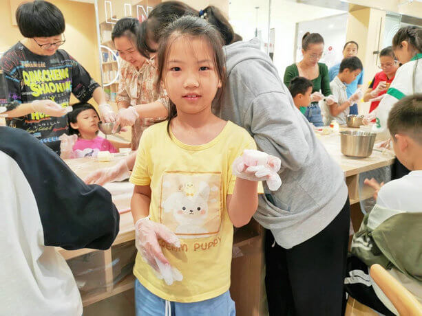 预拌粉、馅料、磨具……孩子们最期待的美食DIY开始了。活动现场志愿者详细地演示着冰皮月饼的制作过程,家长和孩子也同步参与其中。搅拌、揉团、称重、做馅、包裹、滚粉、压膜……漂亮又美味的冰皮月饼就制作好了。