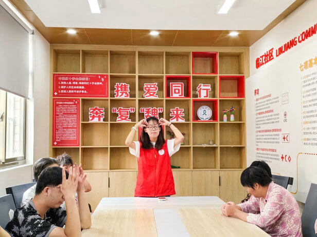 康复员们跟随社工练习了拍拍操, 缓解了工作疲劳。随后,社工用通俗易懂的语言向康复员们介绍了人体的保健穴位,带领着他们一起学习了按揉手法,并向大家介绍了秋季的气候特点以及生活中实用的养生方式,建议大家养成劳逸结合的生活理念、帮助他们树立秋季养生健康观念。