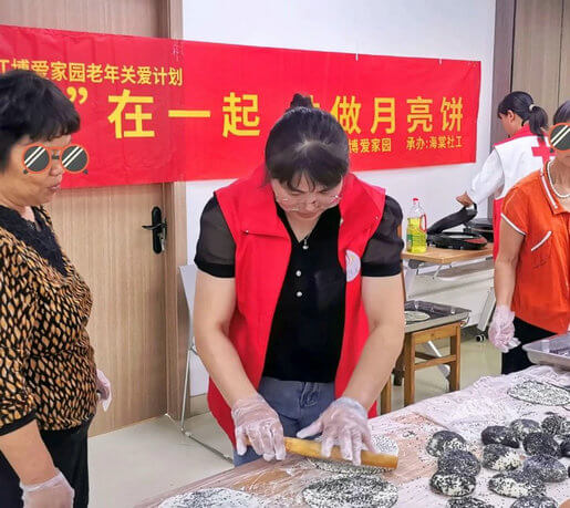 制作、分享月亮饼也是中秋佳节常州重要的节日风俗。在讲解完制作步骤和注意事项后,社工将康复员分组,带领大家感受本地独有的节日氛围。揉面、搓团、包馅、擀面、撒芝麻...大伙儿分工明确,制作流程井然有序。不一会儿,满满几盘月亮饼就已散发着扑鼻的香气。