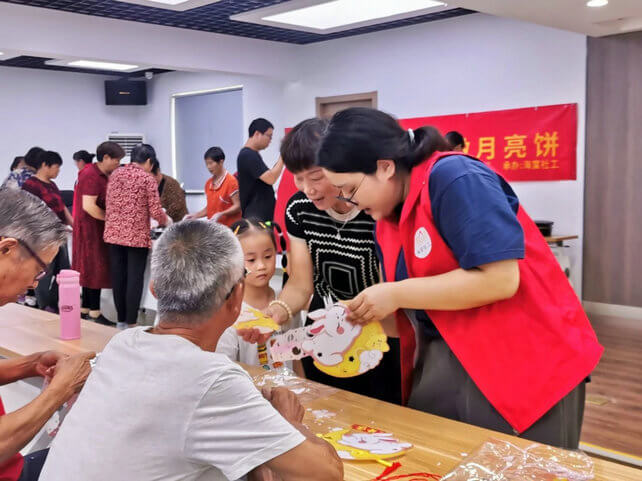 为弘扬中华优秀传统文化,营造浓厚的节日氛围,2023年9月27日下午,临江社区博爱家园、魏村街道德康驿站联合举办“与‘临’在一起,共做月亮饼”中秋主题活动,邀请社区居民一同感受人月两团圆的中秋氛围。